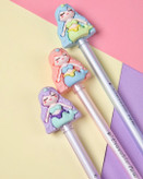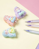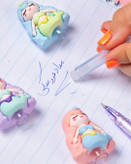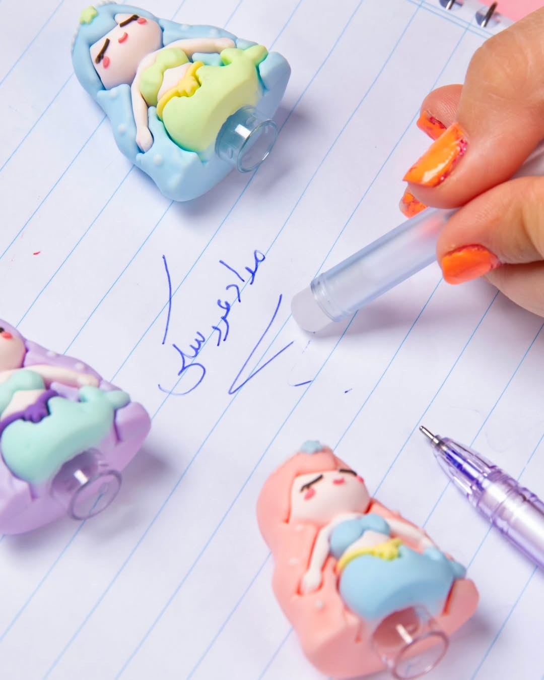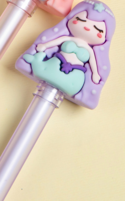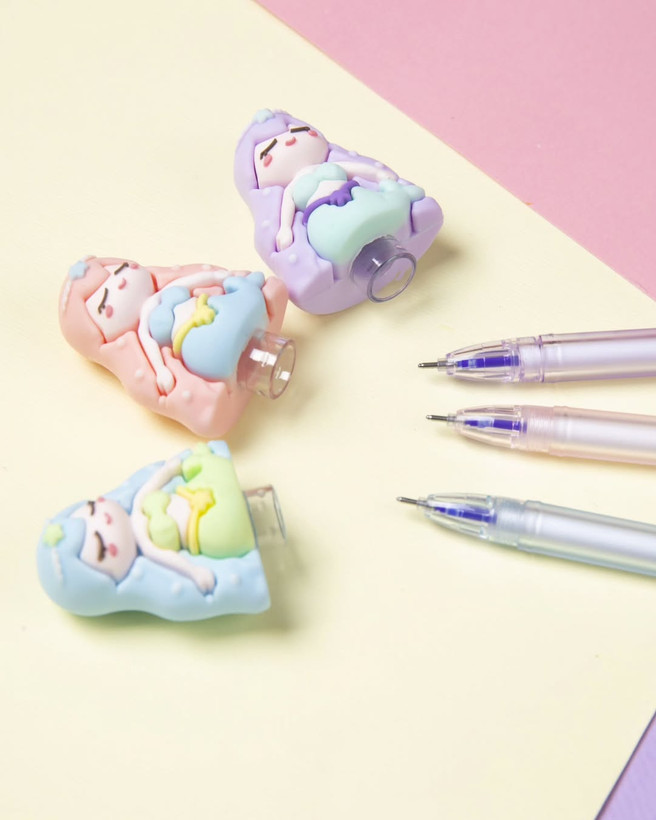روان نویسی که برای دومین بار شارژ شد. باعروسکش روان نویست روپاک میکنی که نه کثیف می شه، نه خراب. انتهای روان نویس هم یه پاک کن اضافه داره. جوهرش آبی هست و ۳تا رنگ بدنه و عروسک زیبا داره. یدک موجود هست.