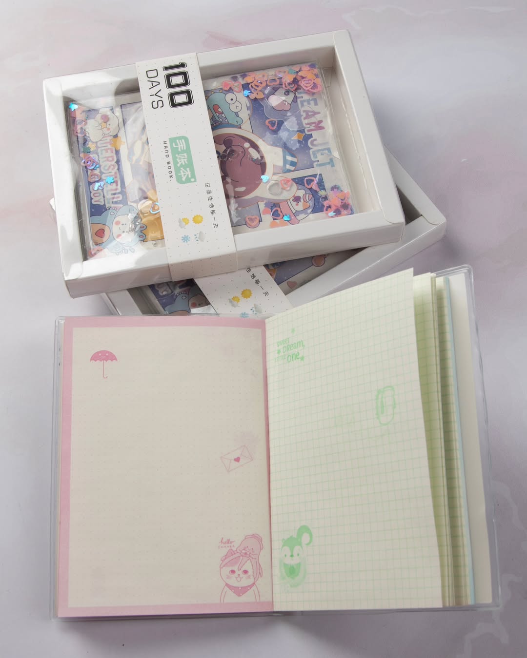 دفتر وارداتی خوشگل و کیوت با ۱۰۰ برگ رنگی و حاشیه دار، قابلیت تعویض کاور و بسته بندی طلقی و بسیار شیک مناسب برای عیدی.