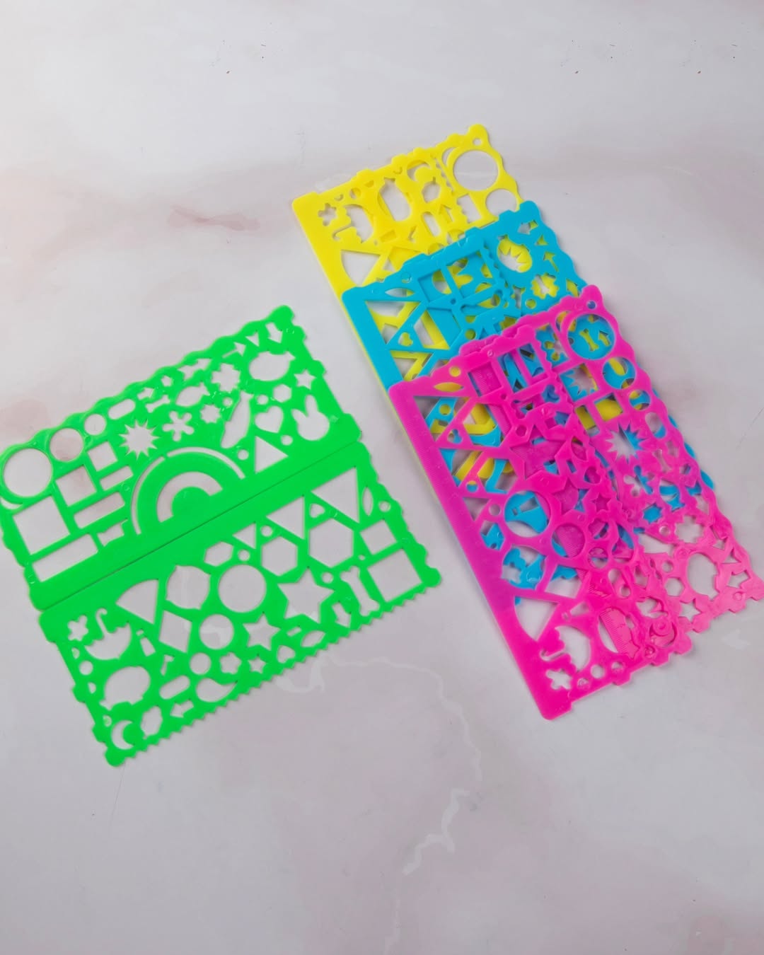 خط کش ژلهای شابلون دار و نشکن ۲۰ سانتی دارای تمام اشکال هندسی در سایزهای مختلف مناسب تمام دانش آموزان عزیزمون هر پک دوتایی